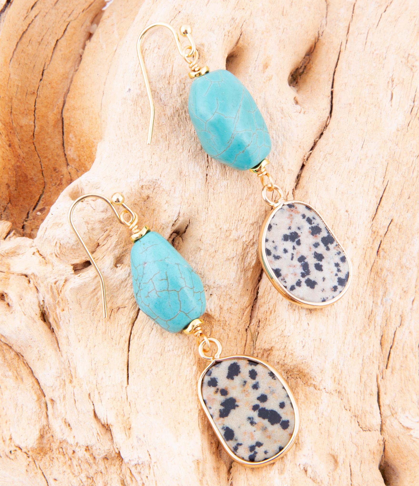 Experience the impeccable craftsmanship of these hand-crafted golden drop earrings! Featuring a stunning blue magnesite stone on top and a beautiful dalmatian jasper stone below, these earrings are the epitome of elegance. Measuring 2.25" in length and .5" at their widest point, with a total weight of 9g, they will add a touch of sophistication to any outfit. Don't miss out on owning this unique and exquisite piece of jewelry!